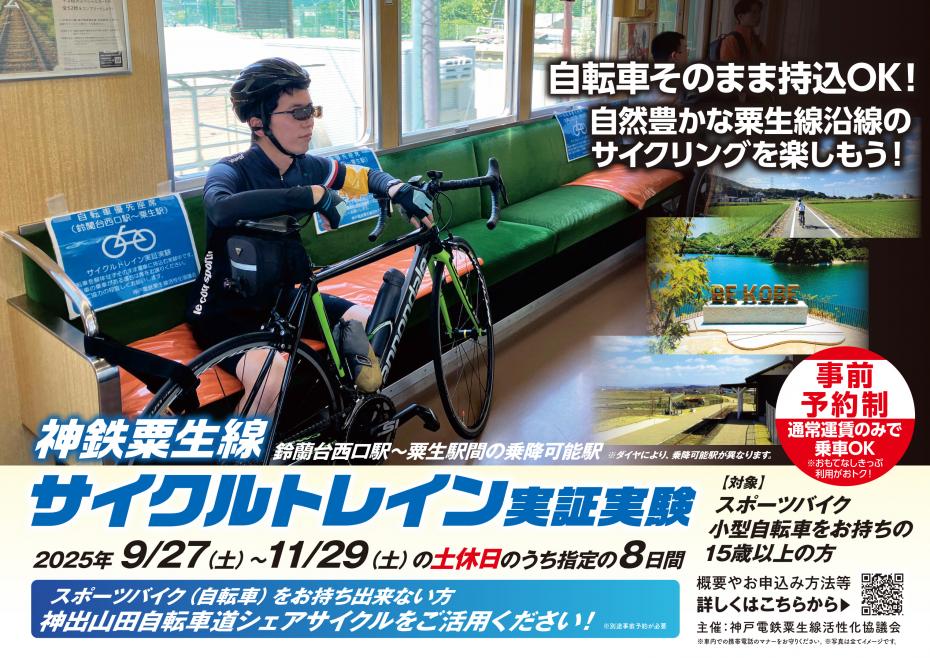 神戸電鉄は開業以降初めて、粟生線の通常列車内に自転車をそのまま持ち込むことができるサイクルトレインの実証実験を行っています。乗車区間の運賃だけで利用可能ですので、ぜひご利用いただき、自然豊かな粟生線沿線でのサイクリングをお楽しみください。※事前予約が必要です。