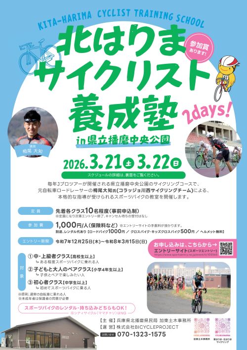 毎年Jプロツアー(国内最高峰のロードレースツアー)が開催される県立播磨中央公園のサイクリングコースで、元自転車ロードレーサーによる本格的な指導が受けられます。レベルに応じたクラスに参加できるので、初心者の方も安心です。