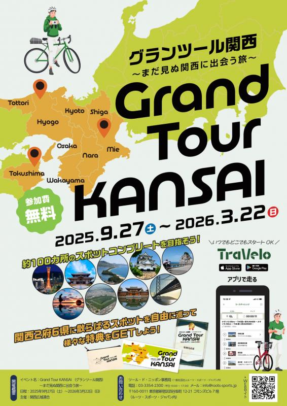 関西一円の広域サイクリングルートを舞台に、ルート周辺の様々なスポットや「ワールドマスターズゲームズ2027関西大会」の競技会場スポットなどを巡る自転車周遊イベントを期間限定で開催。スポットを巡って貯めたポイントで様々な特典をゲットできます。
