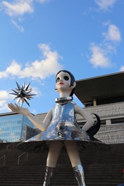 平成27年6月、県立美術館南側の大階段下に彫刻「Sun Sister(サン・シスター)」を設置しました。この作品は現代美術家のヤノベ ケンジさんによる未来の希望の象徴である「輝く太陽」を持った高さ約6mの少女像です。