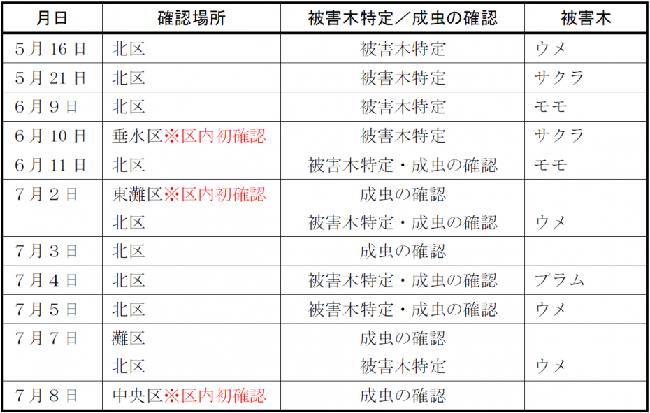 同カミキリの生息範囲はさらに広がっているおそれがあるため、引き続き、市などと連携して周辺調査、地域住民への注意喚起を図ります。