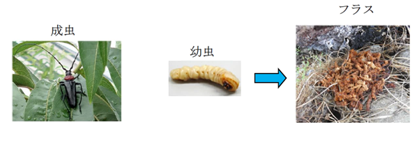 〇幼虫は樹木の中を食い荒らし、フラス(木くずと幼虫が排出するフンが混ざったもの)を大量に出しながら2~3年かけて成長する。このため、食害が進むと樹木が枯死し、ウメ、モモの果樹園では農業被害の発生、公園や街路樹等では倒木などの被害の発生が懸念される。