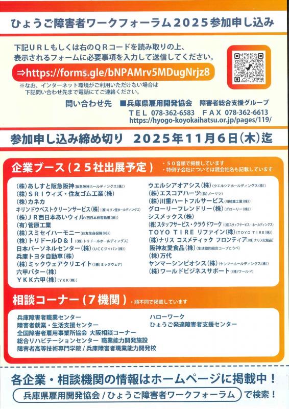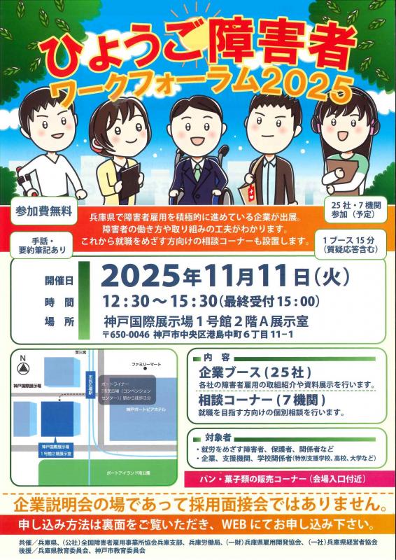 兵庫県では、就労をめざす障害のある方や、障害のある方の雇用を進めたい企業が様々な兵庫県の障害者雇用先進企業と出会い、企業の取組や方針を知ることで、より良い就労や雇用の促進に役立てていただけるよう、「ひょうご障害者ワークフォラム2025」を開催します。