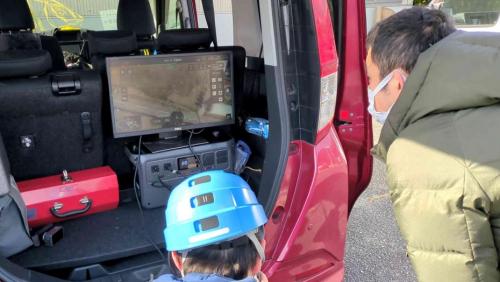 追い払い実証では、サルの出没地まで車で移動、サルを確認次第ドローンを飛ばす。