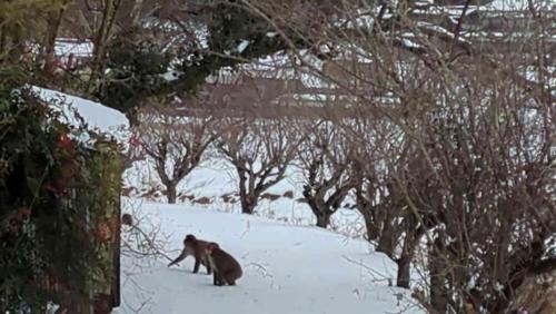 昼1時過ぎに、職員から連絡が入った。急いで現場に向かうと、道端から10数メートル先の雪の原を歩く数頭のサル。近くの竹やぶからもガサガサと音がする。