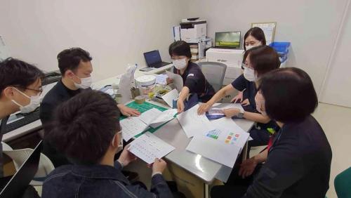 クオトミーのスタッフと看護師たちが、小さなテーブルに頭を突き合わせて、ついに担当・配置表の話が始まる。