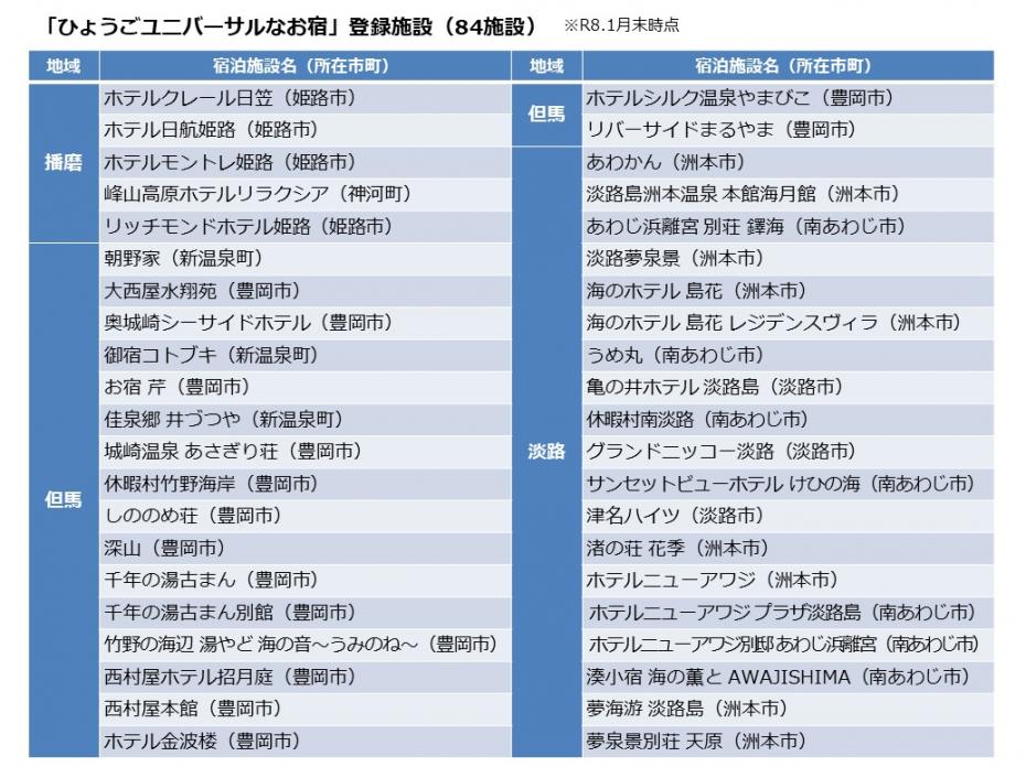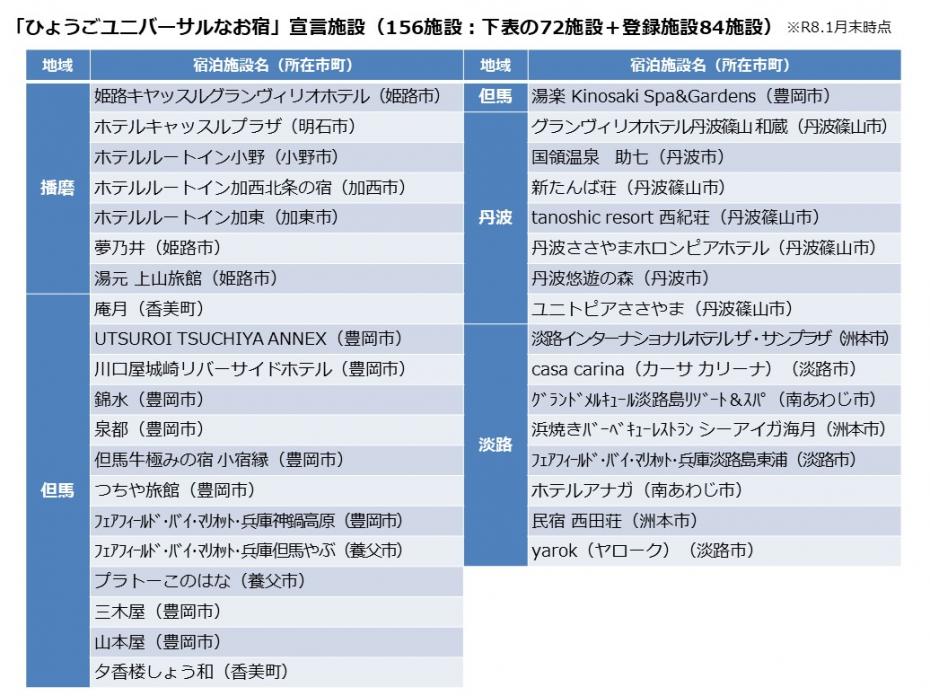 兵庫県では、全国初のユニバーサルツーリズム推進条例に基づき、ユニバーサルツーリズムの推進に積極的に取組む宿泊施設を登録・情報発信する「ひょうごユニバーサルなお宿」宣言・登録制度を実施しています。 令和8年1月末現在、宣言施設は156施設・登録施設は84施設です。