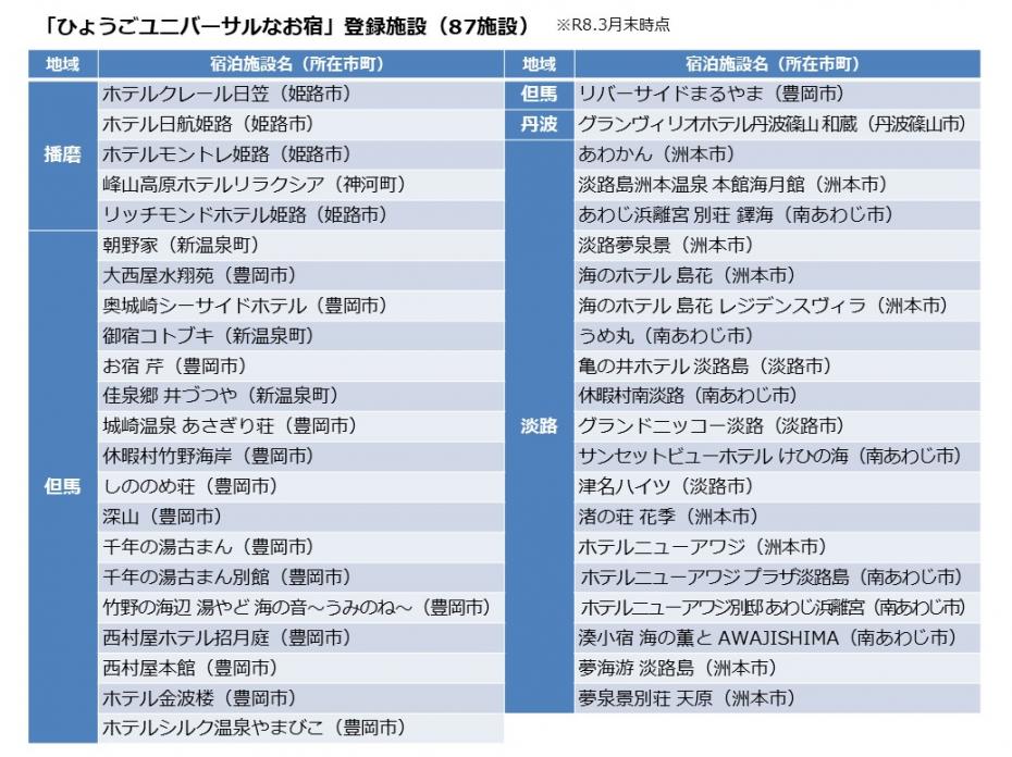 ホーム > 地域・交流・観光 > 観光・レジャー > 観光振興 > ユニバーサルツーリズムの推進 > 「ひょうごユニバーサルなお宿」宣言施設・登録施設一覧