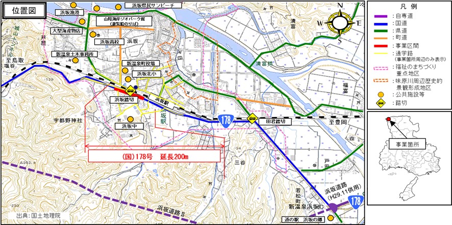本路線は、京都府舞鶴市を起点に兵庫県の豊岡市街地、山陰近畿自動車道を経由し鳥取県岩美町を結ぶ主要幹線道路です。新温泉町内ではJR山陰本線と浜坂駅南側で並走し、浜坂踏切を含む距離の短い町道で都市計画道路の浜坂駅港湾線と接続している交通の要衝となっています。そのため、本事業では付加車線の設置と踏切内を含む歩道の設置を行うことで交通の錯綜を緩和し、付近にある小中学校の生徒、児童の安全を向上するとともに朝夕の慢性的な渋滞の解消を図ります。